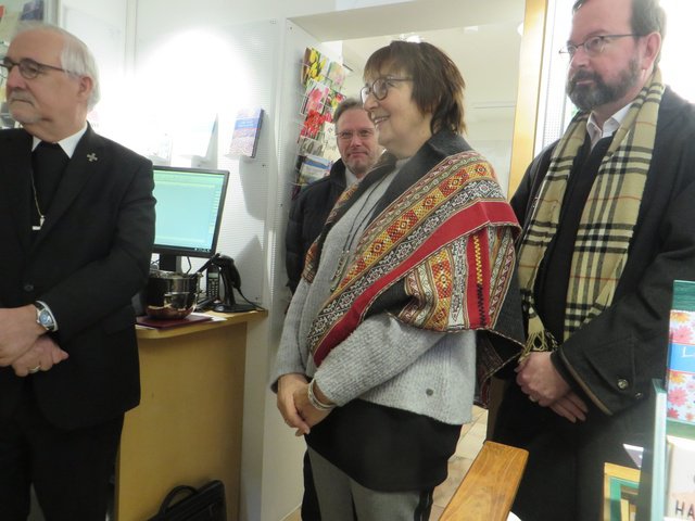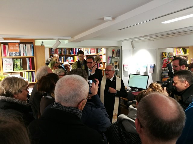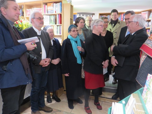 7.2.2020: Bei einer Feierstunde in den Räumen der Buchhandlung „Wekenmann – Bücher, Licht & mehr“ in der Tübinger Lange Gasse hieß es Abschied nehmen, und gleichzeitig auf die Neueröffnung anzustoßen: Eva-Maria Beilschmidt, die die Buchhandlung 17 Jahre lang geführt hatte, übergab die Räume im Beisein von Bischof Gebhard Fürst sowie zahlreichen Verwandten, Freunden und Wegbegleitern an die Schwabenverlag AG und deren Vorstand Ulrich Peters.